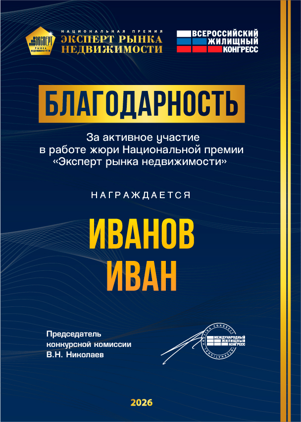 1. Благодарность за активное участие в работе жюри Национальной премии «Эксперт рынка недвижимости»