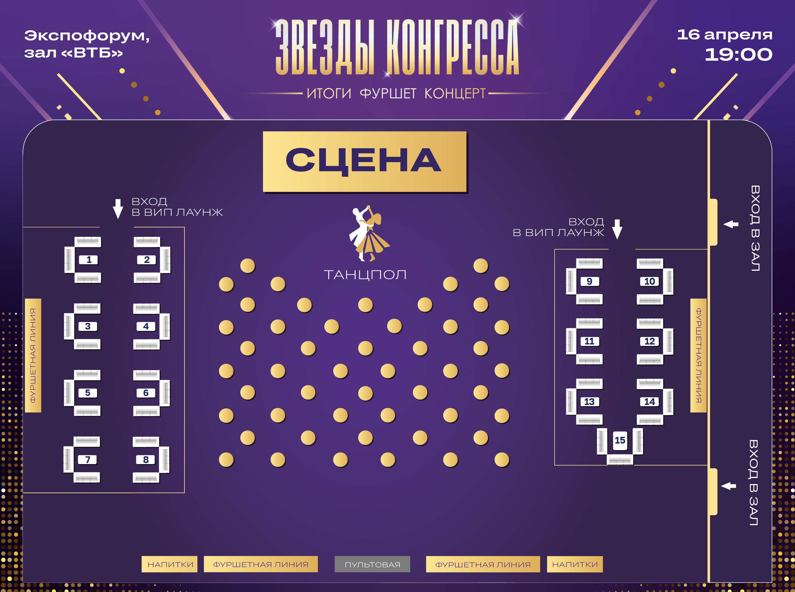 Мероприятие пройдет в формате фуршета на 1000 гостей с изысканными закусками и большим выбором алкогольных напитков. Посадочные места - только для ВИП-участников.