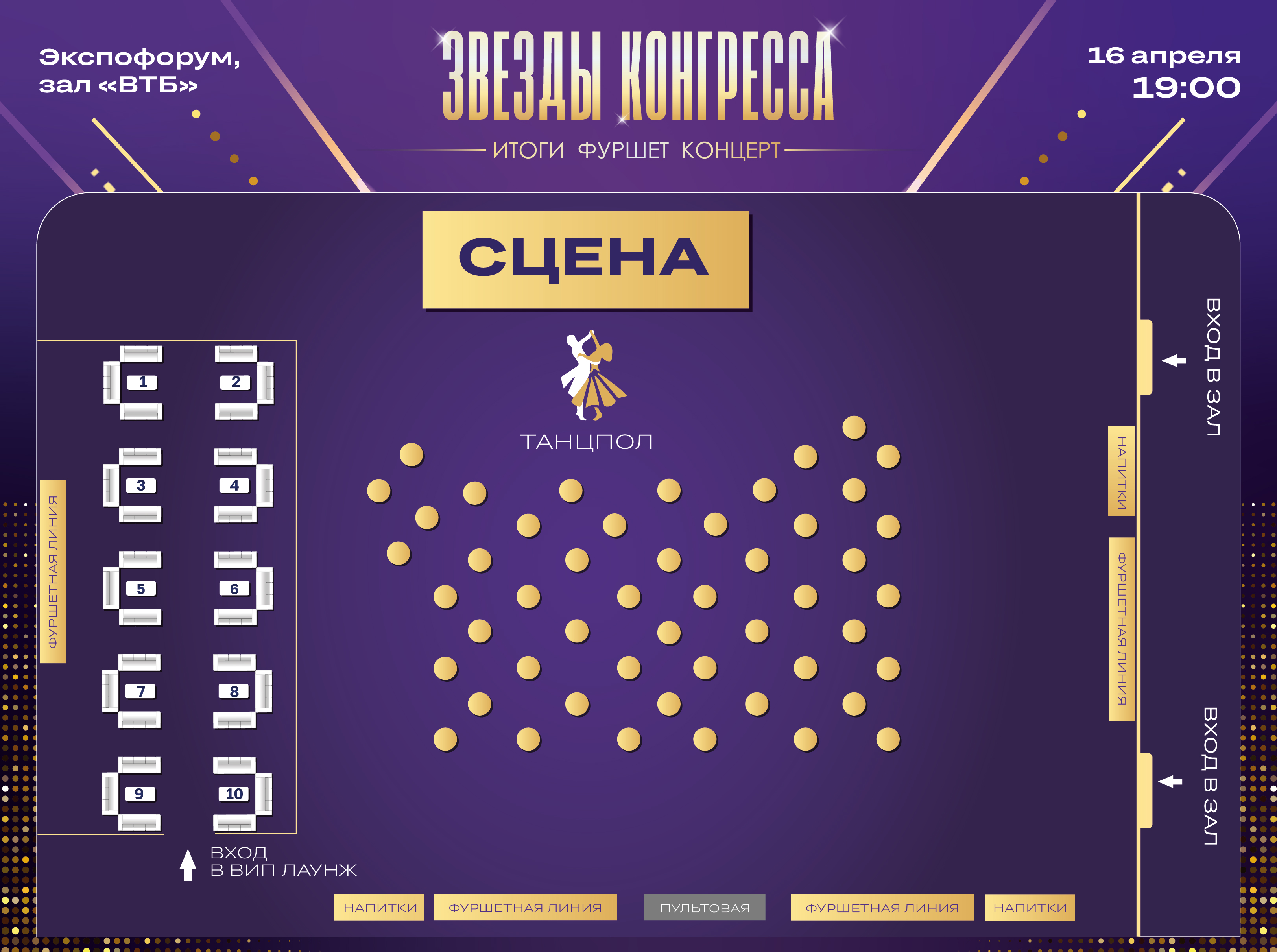 Мероприятие пройдет в формате фуршета на 1000 гостей с изысканными закусками и большим выбором алкогольных напитков. Посадочные места - только для ВИП-участников.