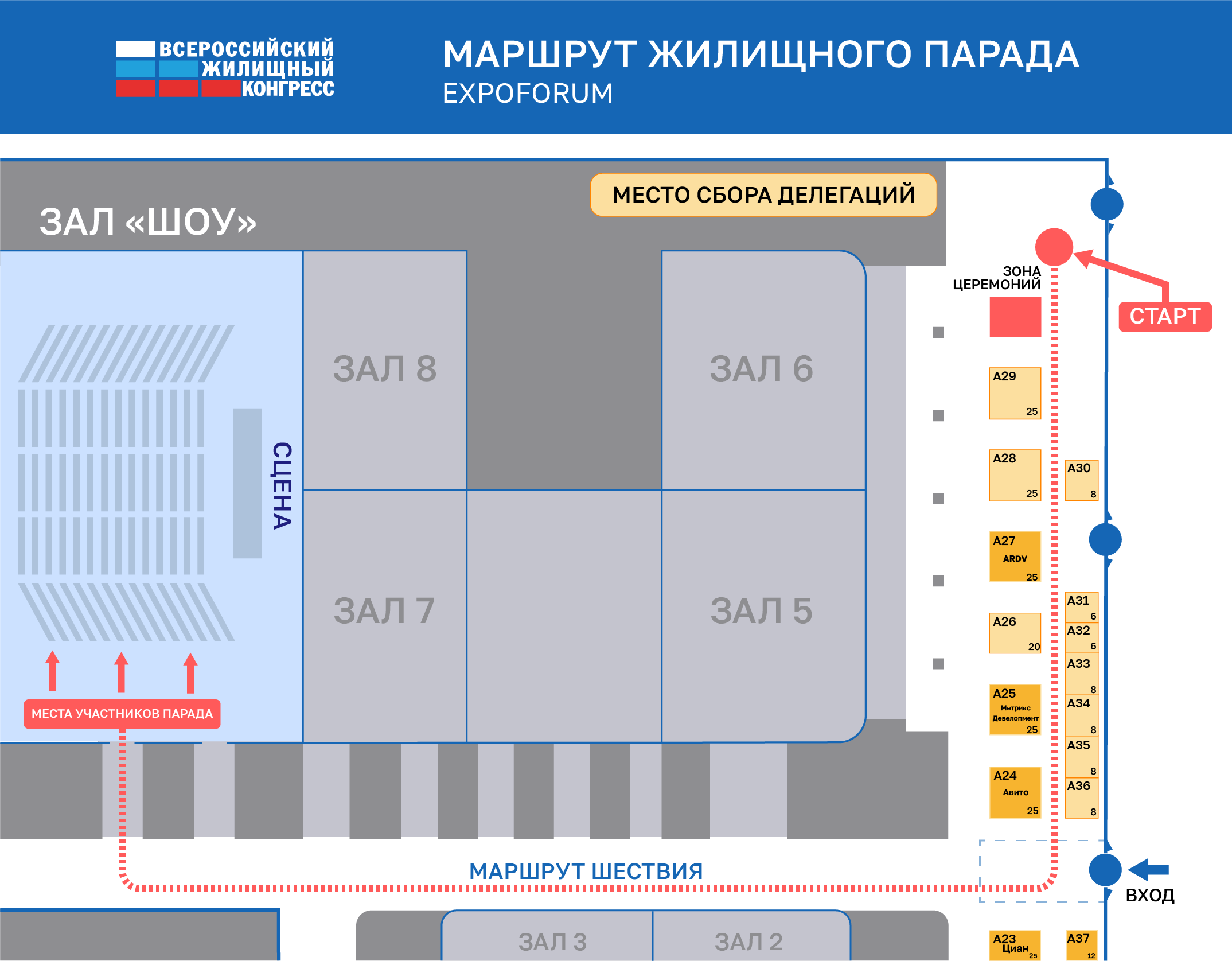 Сбор делегаций и формирование праздничной колонны состоится в 16:00 в Пассаже Экспофорума. Здесь вас встретят представители оргкомитета конгресса и помогут определить место вашей делегации в торжественной колонне.